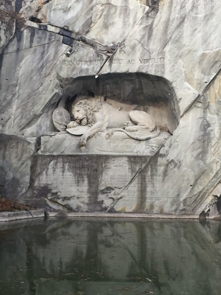 I’m sitting again, this time outside on a bench. I suppose it’s pretty typical to be sitting when writing, but I only seem to mention my state of mobility when I’m stagnant (because I do write when walking as well). Someone just placed their burning cigar in the ashtray beside me and the fruity tobacco smell is floating directly into my face. This moment seems to be a perfect example of what I initially brought my phone out to write about. In front of me is an eerily still stone pool, behind it a wall of stone with a monument of a crying lion carved into it. I’ve been here for less than 10 minutes and already I’ve watched 2 large groups of tourists, mostly Asian (race is an unnecessary addition but I feel like culture can help explain customs and behavior) come, loudly take pictures, and go. There’s an older man sitting on the bench to my right. He just got up and left after I looked over at him to write that last sentence, but he was the reason I sat down in the first place; by witnessing his approach on how to do this tourist attraction I recognized the option to sit and followed. Now 2 others have since looked at me and done the same. Okay I’m getting side tracked, that wasn’t the point of this entry. I just wanted to reflect on the importance of awareness. Prior to coming here I learned that this monument was created in memorial of the Swiss mercenary soldiers who died serving for the French revolution. You can learn more about the history here. The lions expression is extremely sad, and this space feels almost prayerful. When the loud of the tourists hushes, you can hear the chirping of birds against the silent stone. The blatant lack of awareness I observed, to me sitting down-wind from where one chooses to place their burning tobacco, to the meaning of this stonework, reflects to me how the rush that comes with seeing “the things” can take away from actually doing “the things.” Awareness and choices, at the moment those two feel important. Mental note taken.