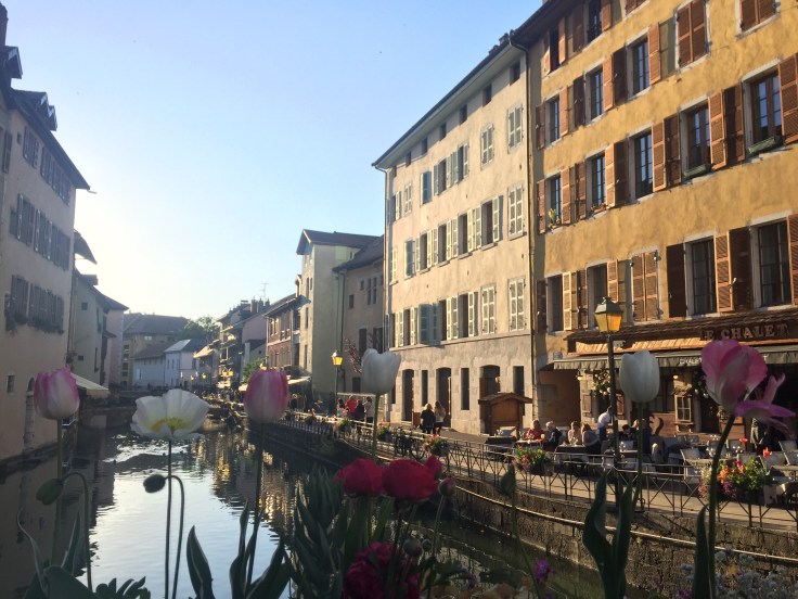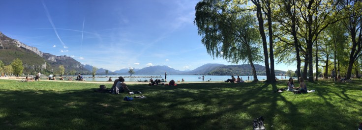 Thursday: drove 40 minutes with my family past lush, flower-filled hills with a panorama of mount blanc, to arrive in Annecy for a day of picnicking by the lake. The hot April sun, the light flush of red wine, slack-liners galore and napping in the grass to the sound of a man’s humming guitar. What a day in France!