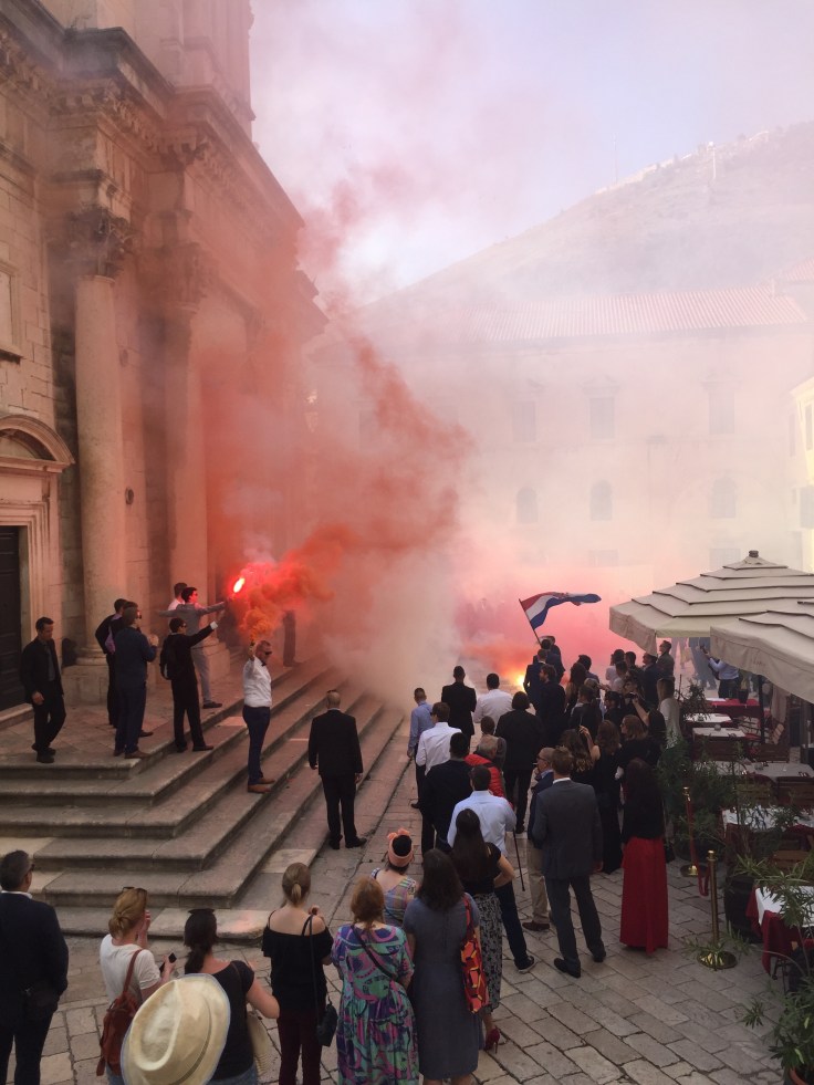 - Stumbled across 2 weddings celebrations. One was quiet, classic and traditional. The other shot a cannon off a ship and lit red and white smoke bombs outside the church while waving the Croatia and singing the national anthem for the newly wedded couple.
