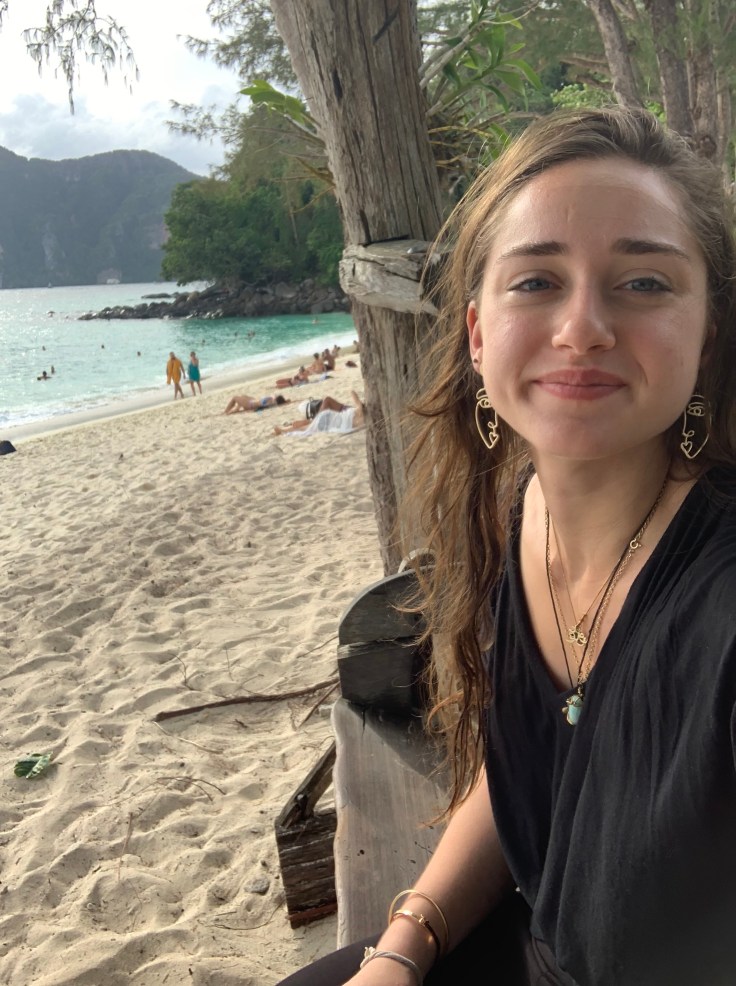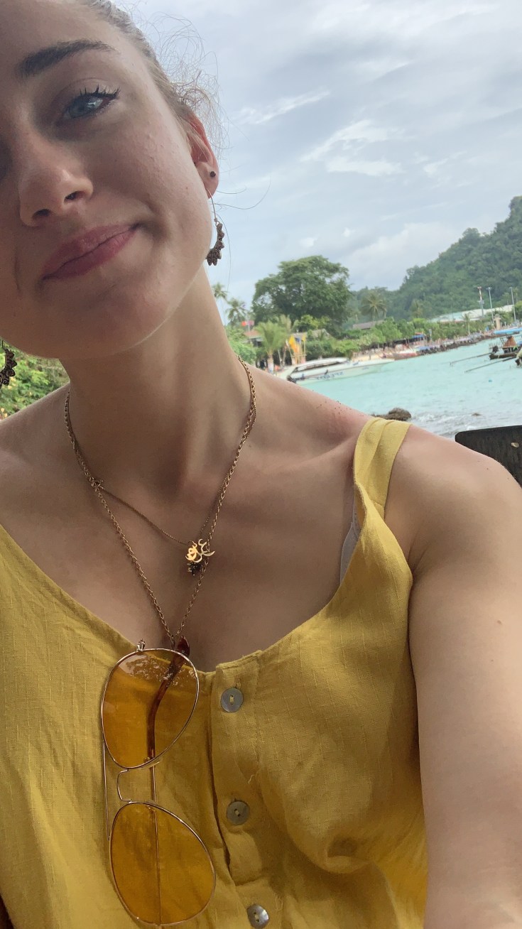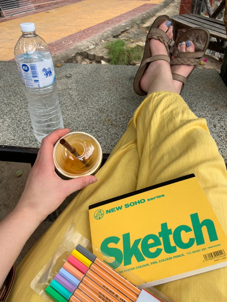 - DEC 12: Yellow vibes day (wore a yellow jumpsuit, yellow sunglasses, drew in a yellow sketchbook, and drank mango smoothie). I tried my first Thai pancake with lemon and sugar. Spent the morning sketching at the perfect table/viewpoint over the beach, directly outside of my hostel.