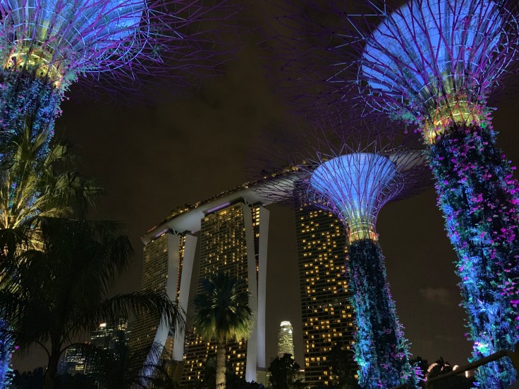 After finding my hostel in Little India and settling in, I grabbed some Indian food from around the corner and transformed into full tourist mode. I took the subway, exited, and wandered the underground shopping mall maze in search of the bay. Spotting an Indian man who shared my uncertain expression, I approached him. He was looking for the same public light show. So we teamed up and I asked a lot of people directions until we found Marina Bay, just in time to sit and exchange fragments of our stories before the fountain, lights, and music took us to a different dimension. Honestly, this was the coolest fountain show I’ve ever witnessed. Classy symphonic sounds and intelligently placed lasers and projections brought the water to life. After this 15 minute performance I walked around the bay, past extravagant hotels and the lotus flower shaped ArtScience museum, and found my way to the Gardens by the Bay. More specifically, I was going to see the Super Tree Garden. Winding through this expansive greenspace, I arrived to Pandora on Earth. Literally, the sculpted trees looked straight out of Avatar. Click here if you didn’t catch that reference. I laid on the concrete with my sweater behind my head and I watched another free light show. The music was more dramatic here…think, intense movie soundtrack. The trees transitioned to different colors, tiny lights flashed with such detail that the trees began to dance. Of course it wasn’t like when living trees wave and flow, but it was a mesmerizing new kind of synchronization.
