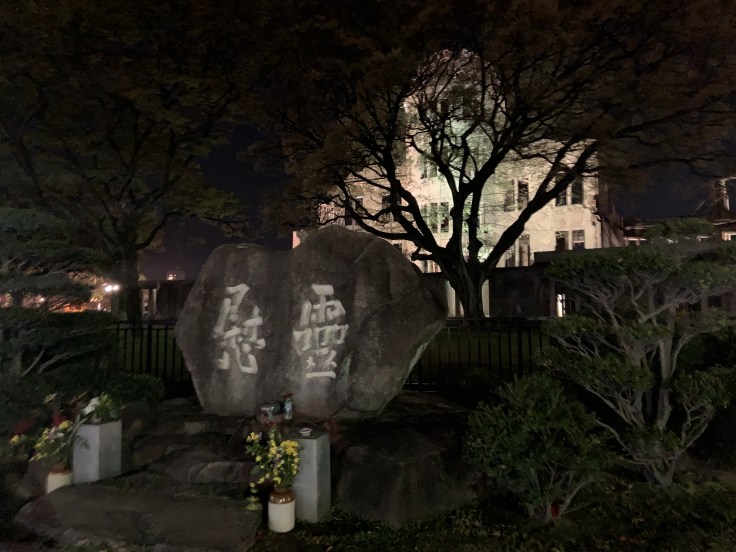 As an Iranian-American, born and raised in the United States, I felt it essential that I visit Hiroshima while in Japan. I needed to see the city that my country demolished…where for the first time in human history a nuclear bomb was dropped. I arrived in the evening and went straight to the A-bomb Dome, remnants of the Hiroshima Prefectural Commercial Exhibition Hall. It was one of the only building frames that stayed standing after the explosion.